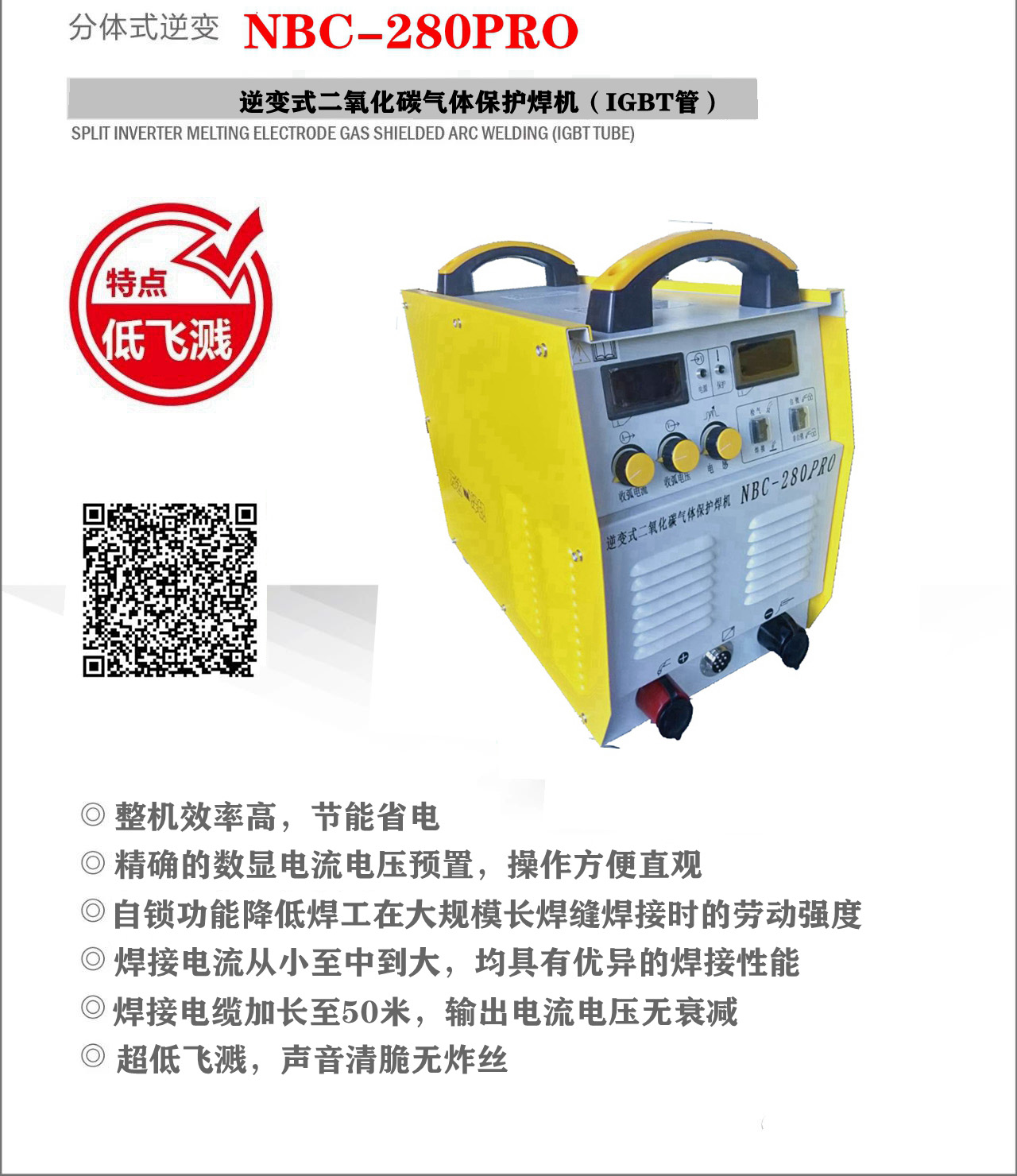 逆变式二氧化碳气体保护焊机PRO款采用IGBT高频软开关逆变技术,前端七芯反馈控制电路,可靠性强,效率高;焊接电流从小电流至中电流到大电流,均具有优异的焊接性能;焊接电缆加长至50米,输出电流电压无衰减;负载持续率高,可长时间持续焊接; 用低价值二氧化碳气体也能达到富氩气体的焊接效果。